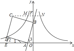 分析 作DE⊥x轴于E,作CF⊥y轴于F,先证明△ADE≌△BAO,得出DE=AO=1,AE=BO=3,同理可证△BCF≌△BAO,得出BF=AO=1,CF=BO=3,求出点D、点C的坐标,再求出双曲线的解析式,求出M的坐标,根据双曲线的对称性得出N的坐标,得出FN=FM,求出CN,即可得出a的值.
