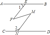 如图,AB∥CD,∠1+∠2=180°,试给出∠EFM与∠NMF的大小关系,并证明你的结论.