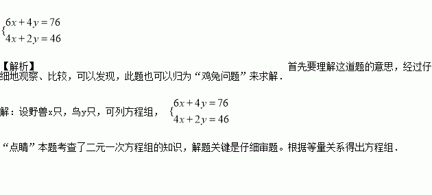 译文:“现在有一种野兽,长有六头四足;有一种鸟,长有四头两足,把它们放一起,共有76头,46足.问野兽、鸟各有多少只?”设野兽x只,鸟y只,可列方程组为__________________.