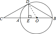 分析 (1)连结OD,如图,由DE⊥BC得到∠DOE+∠ODE=90°,由三角形外角性质得∠DOE=2∠B,加上∠CDE=2∠B,则∠CDE+∠ODE=90°,所以OD⊥CD,于是可根据切线的判定定理得到CD为⊙O的切线;