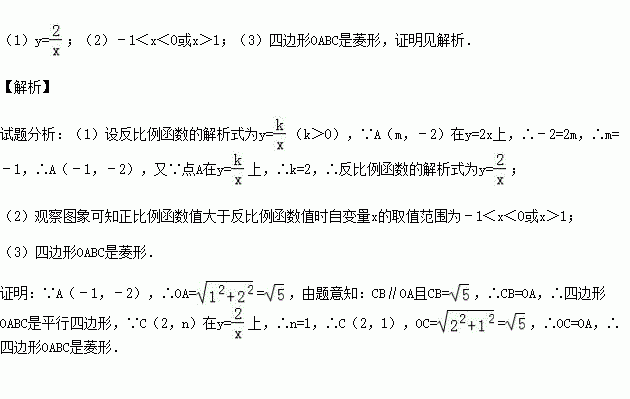 (2)观察图象,直接写出正比例函数值大于反比例函数值时自变量x的取值范围;