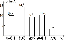 分析 (1)用总人数减去羽毛球、跳绳、篮球和其他的人数,求出喜欢乒乓球的人数,从而补全统计图;