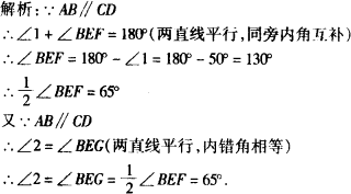 如图所示:已知AB∥CD,直线EF分别交AB、CD于点E、F,EG平分∠BEF,若∠1=50°,则∠2的度数为