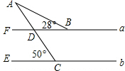 如图,直线a∥b,过点A的两条直线分别与a,b成28°和50°的角,则∠A=