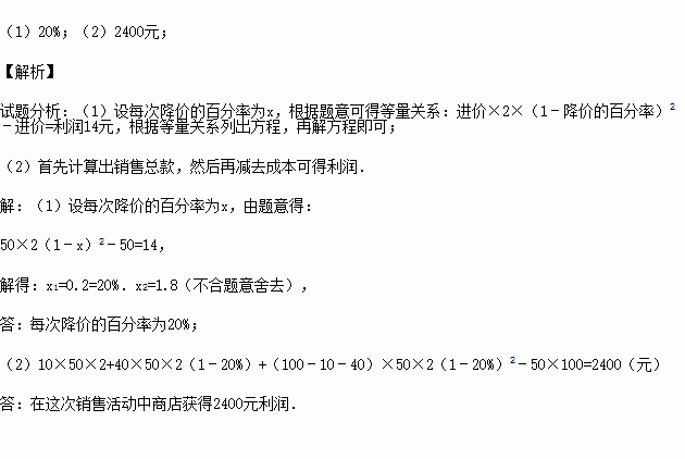 某商店以每件50元的价格购进某种品牌衬衫100件,为使这批衬衫尽快出售,该商店先将进价提高到原来的2倍,共销售了10件,再降低相同的百分率作二次降价处理;第一次降价标出了“出厂价”,共销售了40件,第二次降价标出“亏本价”,结果一抢而光,以“亏本价”销售时,每件衬衫仍有14元的利润.