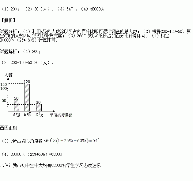(4)根据抽样调查结果,请你估计我市近80000名八年级学生中大约有多少名学生学习态度达标(达标包括A级和B级)