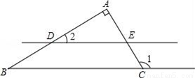 如图,∠1是Rt△ABC的一个外角,直线DE∥BC,分别交边AB、AC于点D、E,∠1=120°,则∠2的度数是______.