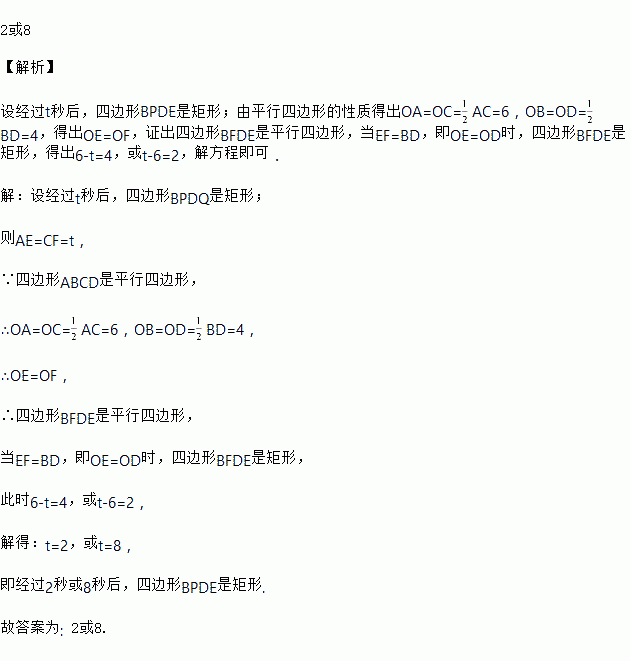 如图,在平行四边形ABCD中,对角线AC,BD相交于点O,动点E以每秒1个单位长度的速度从点A出发沿AC方向运动,点F同时以每秒1个单位长度的速度从点C出发沿CA方向运动,若AC=12,BD=8,则经过________秒后,四边形BEDF是矩形.