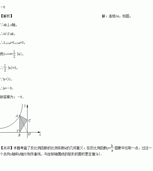 的图象上的一点,过点A作AB⊥x轴,垂足为B,点C为y轴上的一点,连接AC、BC,若△ABC的面积为3,则k的值是 .