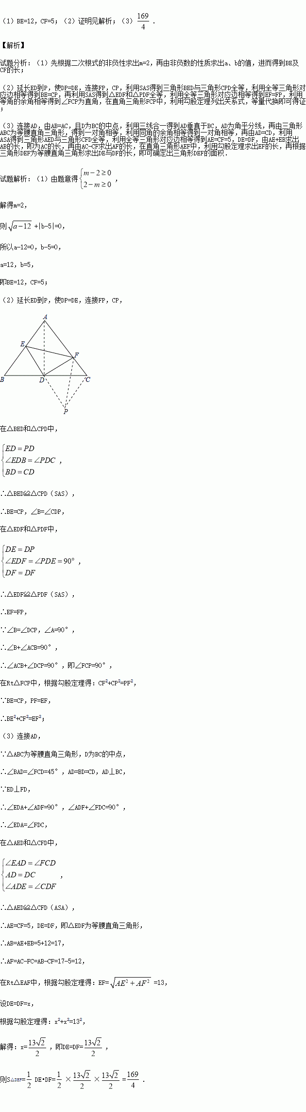 如图:在等腰直角三角形中,AB=AC,点D是斜边BC上的中点,点E、F分别为AB,AC上的点,且DE⊥DF。(1)若设