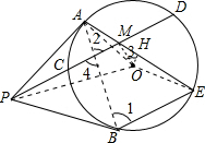 分析 连接OP,AB,OA,OM,OE,作OH⊥AE于点H,由平行线的性质和圆周角定理可得∠4=∠2=∠3,由切线的性质可得PO⊥AB,易得∠OPM=∠MAO,可得P,O,M,A四点共圆,由圆周角定理可得∠PMO=90°,由垂径定理得CM=DM,得出结论.
