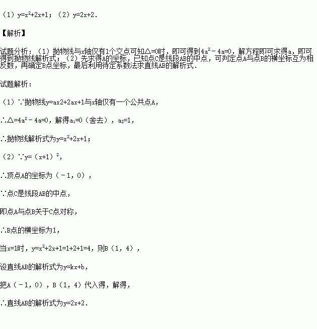 如图,抛物线y=ax2+2ax+1与x轴仅有一个公共点A,经过点A的直线交该抛物线于点B,交y轴于点C,且点C是线段AB的中点.