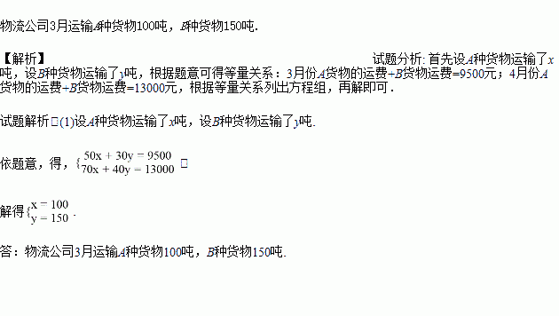 某物流公司承接A、B两种货物运输业务,已知3月份A货物运费单价为50元/吨,B货物运费单价为30元/吨,共收取运费9500元;4月份由于工人工资上涨,运费单价上涨情况为:A货物运费单价增加了40%,B货物运费单价上涨到40元/吨;该物流公司4月承接的A种货物和B种货物的数量与3月份相同,4月份共收取运费13000元.试求该物流公司3月份运输A、B两种货物各多少吨?