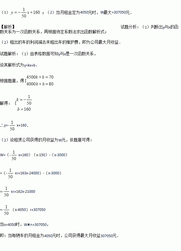 (1)观察表格,用所学过的一次函数、反比例函数或二次函数的有关知识求出每月租出的车辆数y(辆)与每辆车的月租金x(元)之间的关系式.
