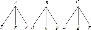 某市今年中考理、化实验操作考试,采用学生抽签方式决定自己的考试内容.规定:每位考生必须在三个物理实验(用纸签A、B、C表示)和三个化学实验(用纸签D、E、F表示)中各抽取一个进行考试,小刚在看不到纸签的情况下,分别从中各随机抽取一个.