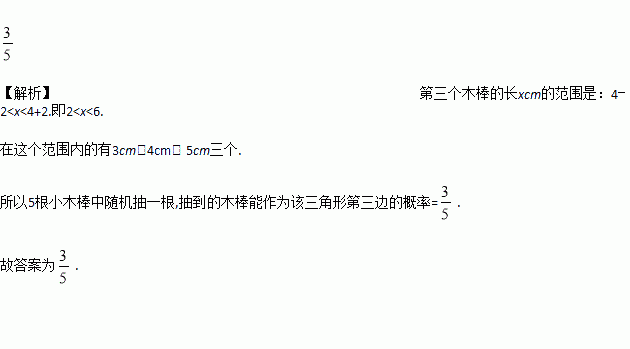 五根小木棒中随机抽一根,抽到的木棒能作为该三角形第三边的概率是______________.