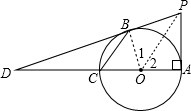 (2)由△PAO≌△PBO得到∠1=∠2,则可证明BC∥BC,根据平行线分线段成比例定理得到$\frac{BD}{BP}$=$\frac{CD}{OC}$=2,则可设BP=a,OC=R,则BD=2a,CD=2R,在Rt△OBD中,利用勾股定理得R2+(2a)2=(3R)2,解得a=$\sqrt{2}$R,所以PA=PB=$\sqrt{2}$R,然后在Rt△POA中,利用勾股定理计算出OP=$\sqrt{3}$R,则可根据余弦定义得到cos∠2=$\frac{OA}{OP}$=$\frac{\sqrt{3}}{3}$,于是有cos∠BCA=$\frac{\sqrt{3}}{3}$.