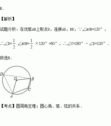 如图,⊙O中,劣弧AB所对的圆心角∠AOB=120°,点C在劣弧AB上,则圆周角∠ACB=( )