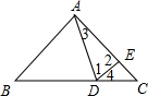解答 解:∵∠3+∠1+∠4+∠C=180°,又∠1=∠2,∠2=∠4+∠C,∴∠3+2∠4+2∠C=180°,又∠3+2∠C=180°-50°=130°,∴2∠4=50°,则∠4=25°,即∠EDC的度数为25°.