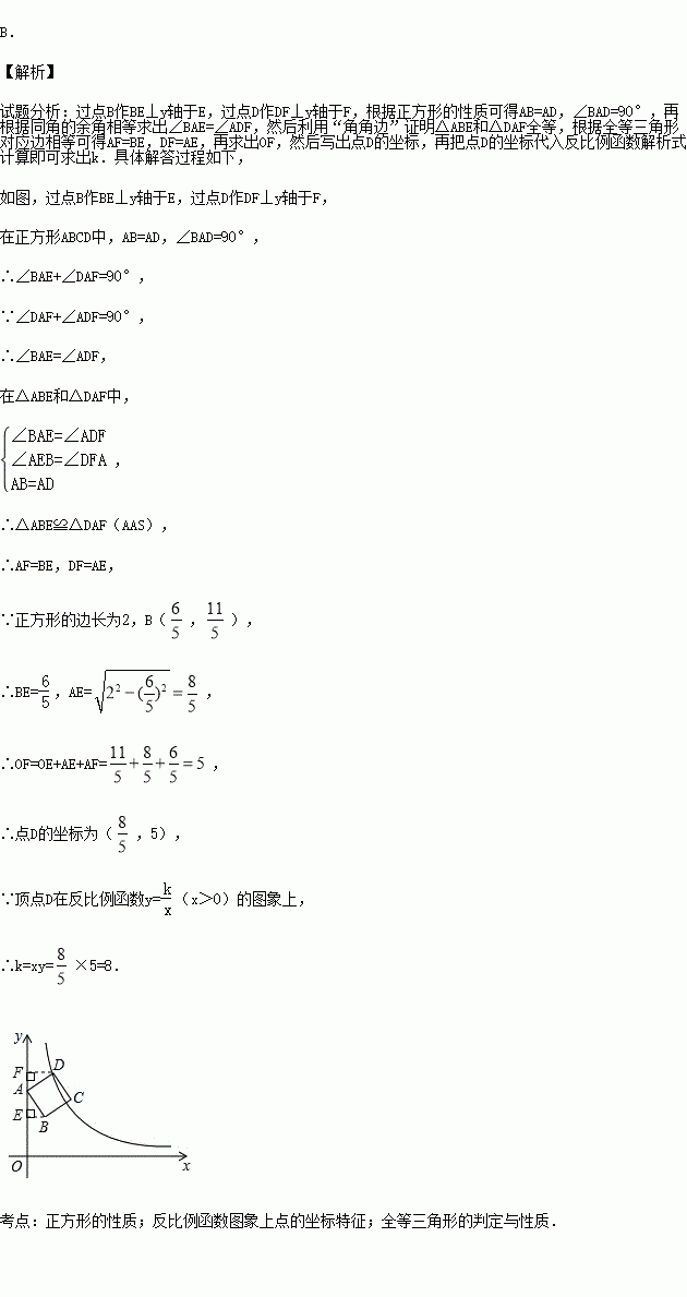 如图,边长为2的正方形ABCD的顶点A在y轴上,顶点D在反比例函数y=(x>0)的图像上,已知点B的坐标是(