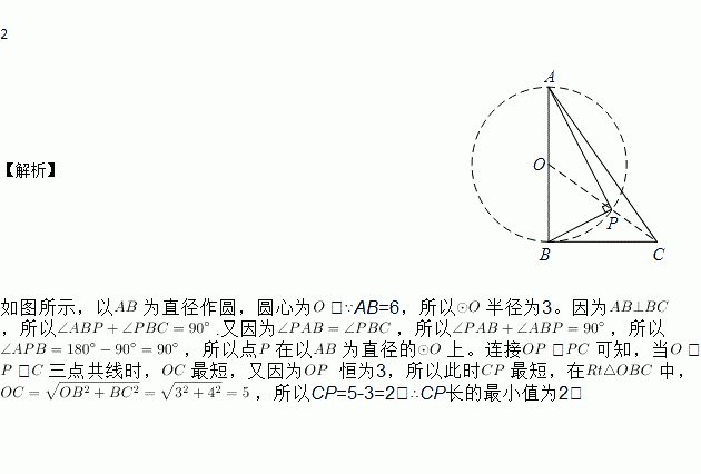 如图,Rt△ABC中,AB⊥BC,AB=6,BC=4,P是△ABC内部的一个动点,且满足∠PAB=∠PBC,则线段CP长的最小值为________.