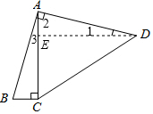 分析 过D作DE⊥AC与E点,设BC=a,则AC=4a,根据等角的余角相等得到∠1=∠3,易证得△ABC≌△DAE,所以AE=BC=a,DE=AC=4a,得到EC=AC-AE=4a-a=3a,在Rt△DEC中,根据勾股定理得到DC=5a,所以有x=5a,即a=$\frac{1}{5}$x;根据四边形ABCD的面积y=三角形ABC的面积+三角形ACD的面积,即可得到y=$\frac{1}{2}$×a×4a+$\frac{1}{2}$×4a×4a=10a2=$\frac{2}{5}$x2.