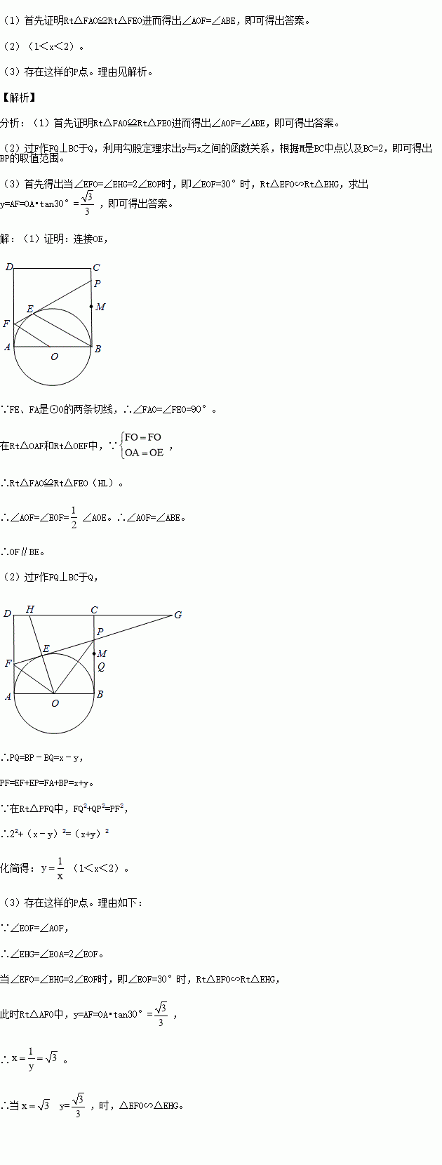 如图1,正方形ABCD的边长为2,点M是BC的中点,P是线段MC上的一个动点(不与M、C重合),以AB为直径作⊙O,过点P作⊙O的切线,交AD于点F,切点为E.