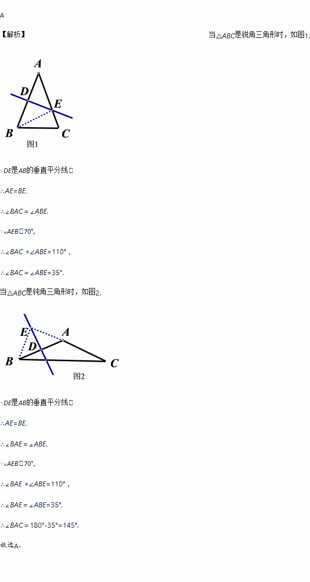 △ABC中AB=AC,AB的垂直平分线交AB于点D,交直线AC于点E,∠AEB=70°;