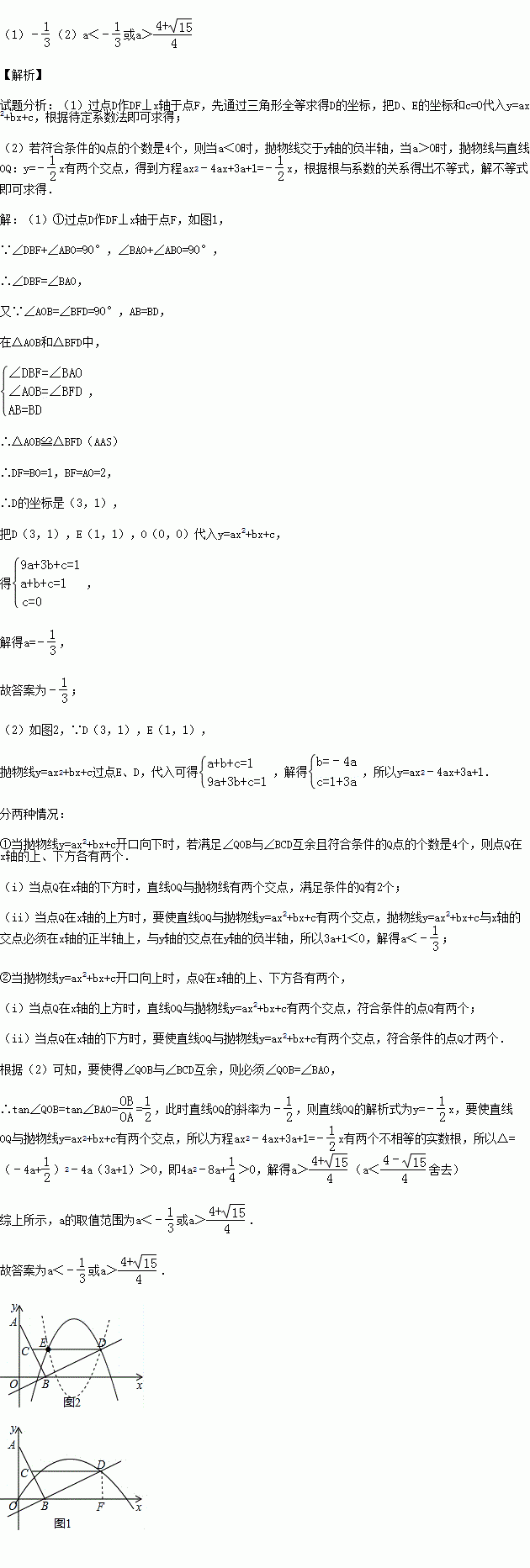 (2)若点Q在抛物线上,且满足∠QOB与∠BCD互余,要使得符合条件的Q点的个数是4个,则a的取值范围是 .