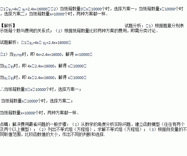 方案二:由工厂租赁机器加工制作.工厂需要一次性投入机器安装等费用16000元,每加工一个纸箱还需成本费2.4元.