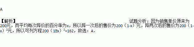 某商品经过连续两次降价,销售单价由原来200元降到162元.设平均每次降价的百分率为x,根据题意可列方程为( )