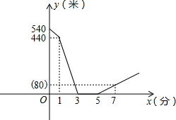 运动会前夕,小明和小亮相约晨练跑步。小明比小亮早1分钟离开家门,3分钟后迎面遇到从家跑来的小亮,两人沿滨江路并行跑了2分钟后,决定进行长跑比赛,比赛时小明的速度始终是180米/分,小亮的速度始终是220米/分。下图是两人之间的距离y(米)与小明离开家的时间x(分钟)之间的函数图象,根据图象回答下列问题: