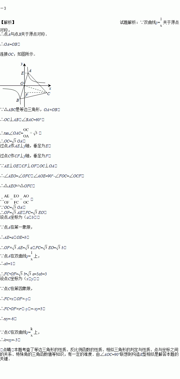 在第一象限的分支上的一个动点,连结AO并延长交另一分支于点B,以AB为边作等边△ABC,点C在第四象限.随着点A的运动,点C的位置也不断变化,但点C始终在双曲线