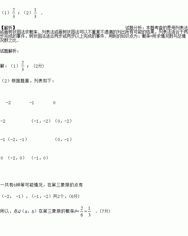 (2)先从中任意抽取一张卡片,以其正面数字作为a的值,然后再从剩余的卡片随机抽一张,以其正面的数字作为b的值,请用列表法或画树状图法,求点Q(a,b)在第三象限的概率.