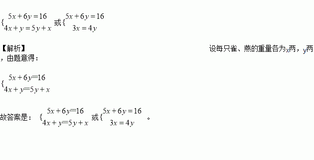 中国古代的数学专著《九章算术》有方程问题:“五只雀、六只燕,共重1斤(等于16两),雀重燕轻.互换其中一只,恰好一样重.”设每只雀、燕的重量各为x两,y两,可得方程组是 ___