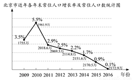 “十二五”以来,北京市人口增长过快导致城市不堪重负,是造成交通拥堵,能源匮乏等“大城市病”的根源之一.右图是根据北京市统计局近年各年末常住人口增长率及常住人口数的相关数据制作的统计图.