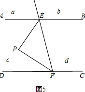 当P点在区域c时,如图5,∠EPF+∠PEB+∠PFC=360°;![]()
