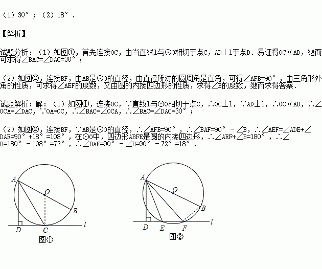 (2)如图②,当直线l与⊙O 相交于点E、F时,若∠DAE=18°,求∠BAF的大小.