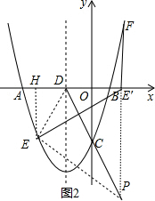 (3)①利用二次函数图象上点的坐标特征设E(m,$\frac{1}{2}$m2+2m-2$\sqrt{3}$)(m<0),过E作EH⊥x轴于H,连结DE,如图2,则DH=-2-m,EH=-$\frac{1}{2}$m2-2m+2$\sqrt{3}$,由(2)得∠ODC=60°,再利用轴对称性质得DC平分∠EDE′,DE=DE′,则∠EDE′=120°,所以∠EDH=60°,于是在Rt△EDH中利用三角函数的定义可得-$\frac{1}{2}$m2-2m+2$\sqrt{3}$=(-2-m)•$\sqrt{3}$,解得m1=2$\sqrt{3}$(舍去),m2=-4,则E(-4,-2$\sqrt{3}$),接着计算出DE=4,所以DE′=4,于是得到E′(2,0),然后计算x=2时得函数值即可得到F点坐标;
