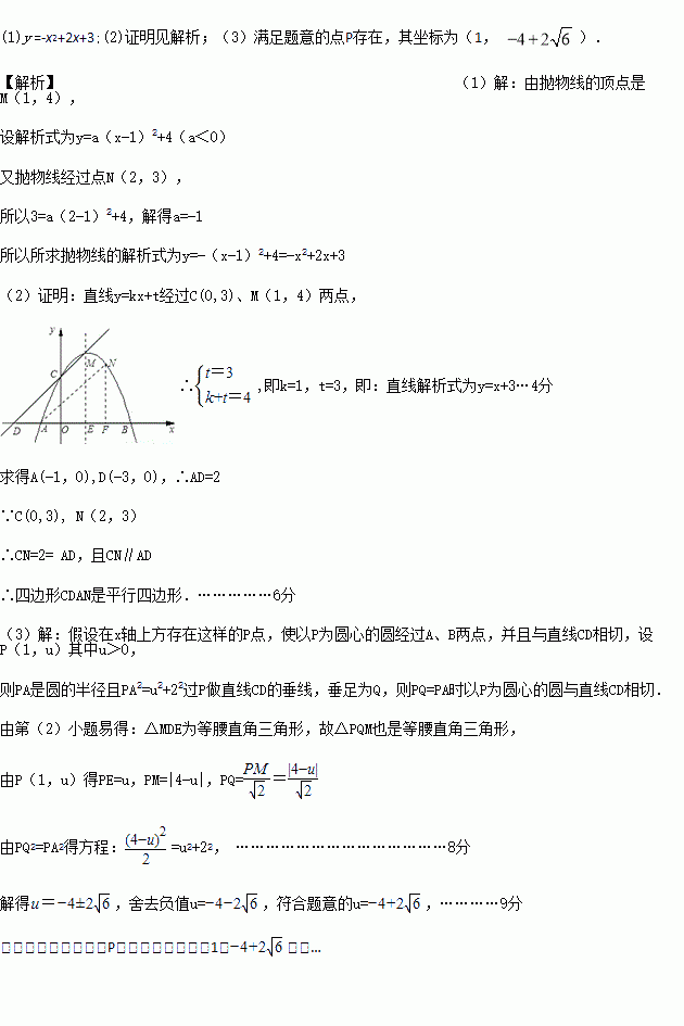 (2)若直线y=kx+t经过C、M两点,且与x轴交于点D,试证明四边形CDAN是平行四边形;