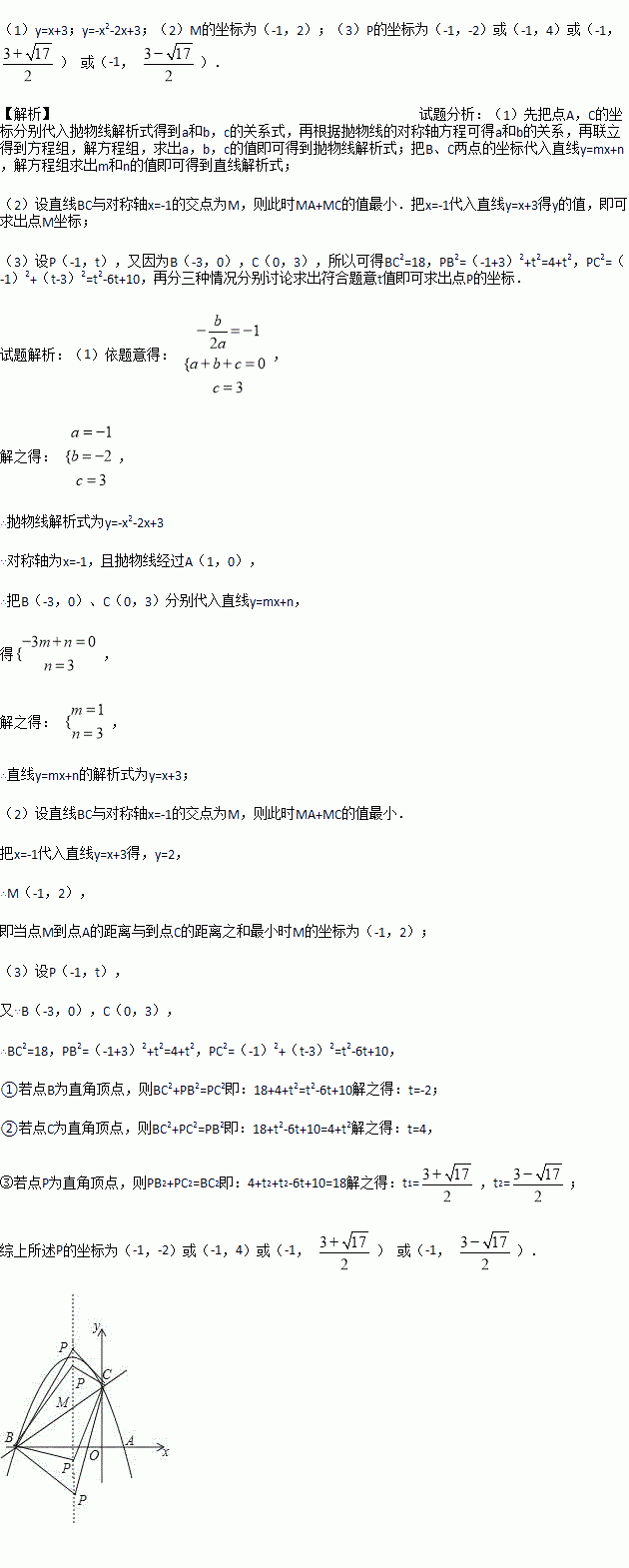 (3)设点P为抛物线的对称轴x=-1上的一个动点,求使△BPC为直角三角形的点P的坐标.