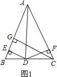分析 (1)连结AD,根据S△ABC=S△ABD+S△ACD,利用三角形面积公式即可得出CG=DE+DF;