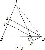 (2)分两种情况:如图2,点D在CB的延长线上;如图3,点D在BC的延长线上;进行讨论,根据三角形面积公式即可得出线段DE、DF、CG之间的数量关系.