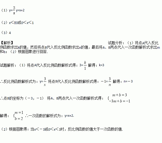 的图象与一次函数y=mx+b的图象交于A(1,3),B(n,-1)两点.