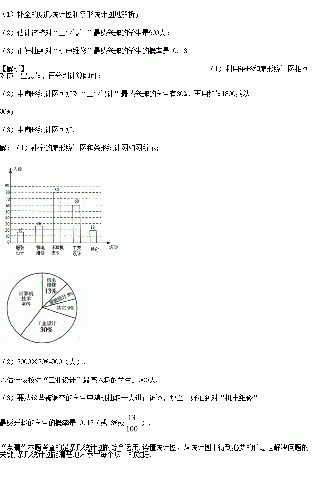 (2)若该校共有3000名学生,请估计该校对“工艺设计”最感兴趣的学生有多少人?