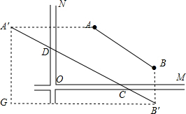 分析 过A作关于ON的对称点A',过B作关于OM的对称点B',连接A'B',交ON于点D,交OM于点C,求出A'B'的值即可.