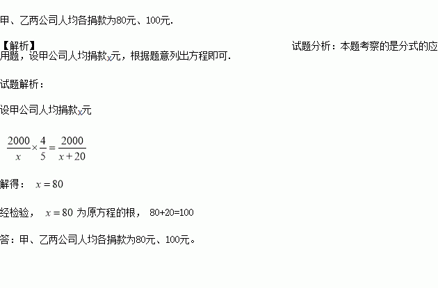 甲、乙两公司各为“希望工程”捐款2000元.已知乙公司比甲公司人均多捐20元,