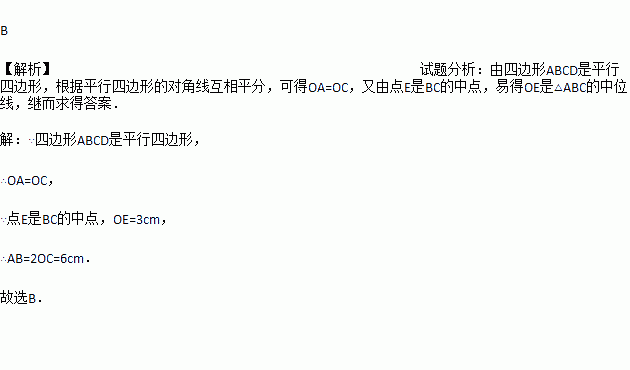 如图,□ABCD中,对角线AC、BD交于点O,点E是BC的中点.若OE=3cm,则AB的长为( )