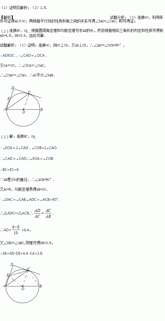 (2) 连接CE,若CE=6,AC=8,求AE的长.