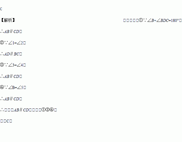 如图,有以下四个条件:①∠B+∠BCD=180°,②∠1=∠2,③∠3=∠4,④∠B=5,其中能判定AB∥CD的条件的个数有( ) 个